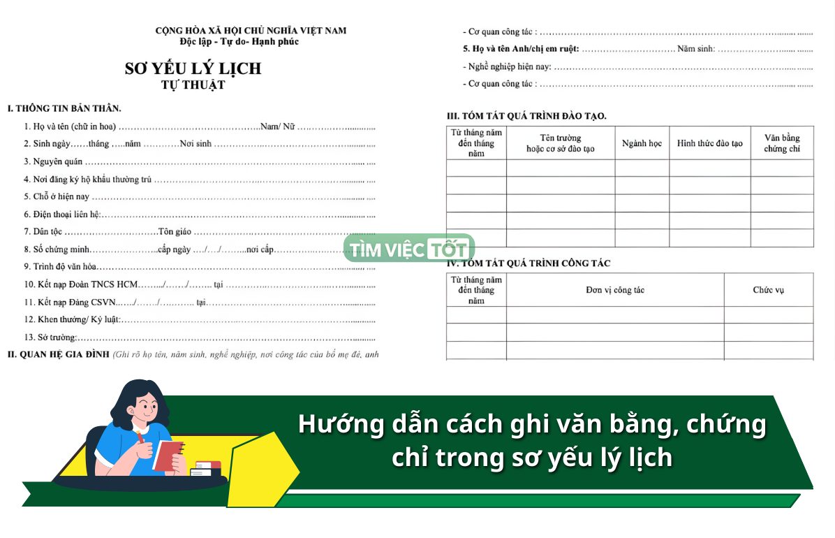 Văn bằng, chứng chỉ là một trong những nội dung quan trọng của Sơ yếu lý lịch, được sử dụng làm căn cứ để đánh giá trình độ học vấn cũng như năng lực chuyên môn của người kê khai. Tuy nhiên, trên thực tế vẫn còn nhiều người lúng túng, không biết nên ghi mục này như thế nào cho đúng và đầy đủ. Bài viết dưới đây sẽ hướng dẫn chi tiết cách kê khai Văn bằng, chứng chỉ trong sơ yếu lý lịch theo đúng chuẩn, giúp hồ sơ của bạn rõ ràng và thuyết phục hơn.