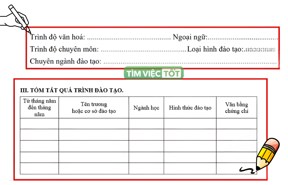 Ở phần này, các mục thường được trình bày riêng biệt như “Trình độ văn hóa”, “Trình độ chuyên môn”, “Ngoại ngữ”, “Loại hình đào tạo”, “Chuyên ngành đào tạo”, một số mẫu còn có thêm mục “Chứng chỉ tin học”.