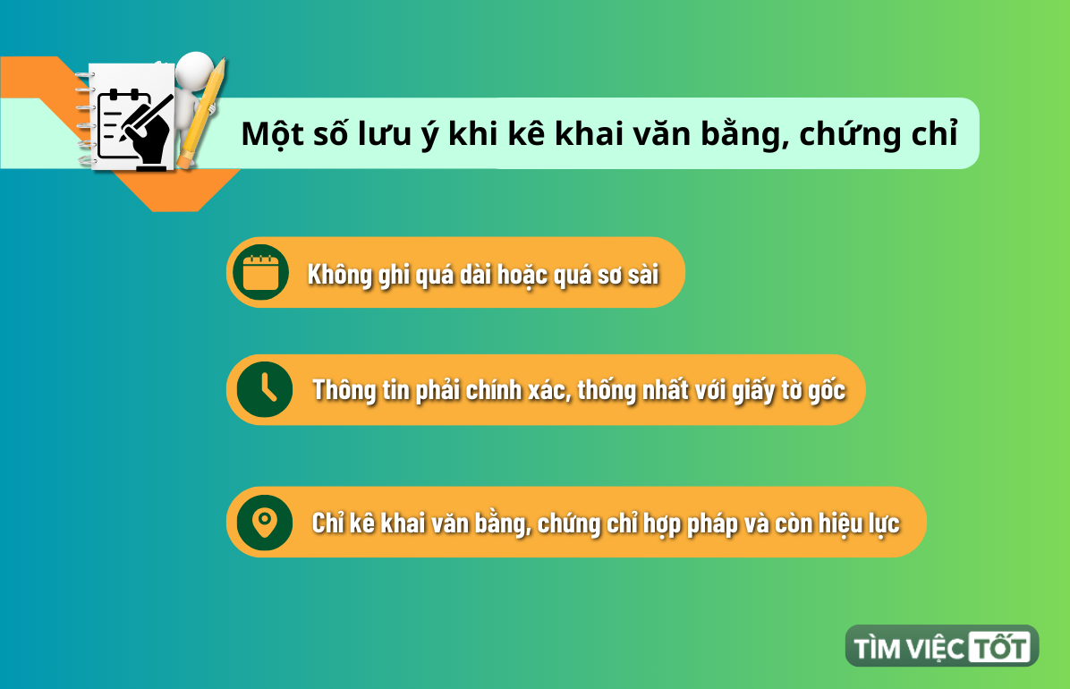 Chỉ kê khai văn bằng, chứng chỉ hợp pháp và còn hiệu lực: Các chứng chỉ phải do đơn vị có thẩm quyền cấp và còn giá trị sử dụng tại thời điểm nộp hồ sơ, đặc biệt là các chứng chỉ ngoại ngữ có thời hạn.